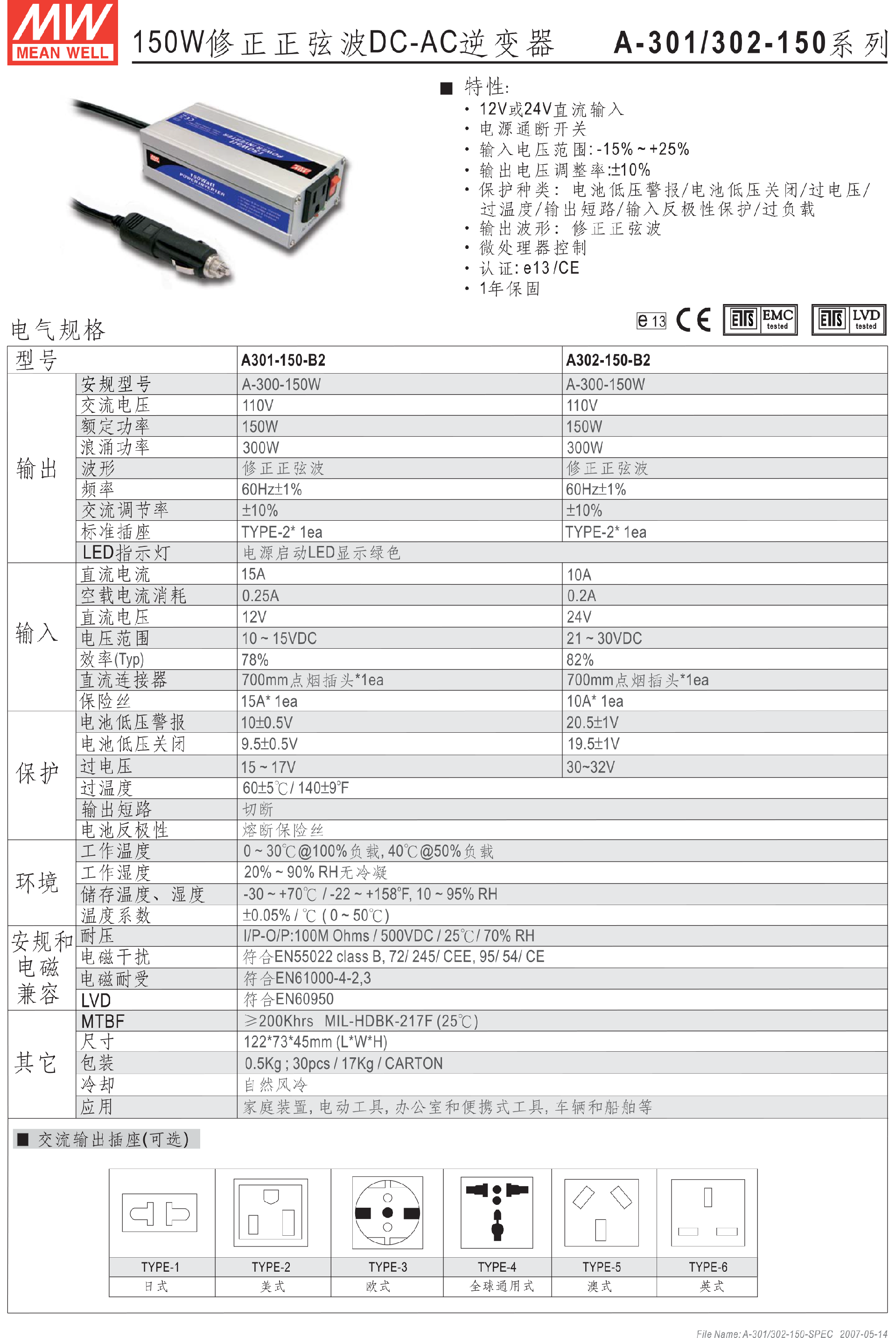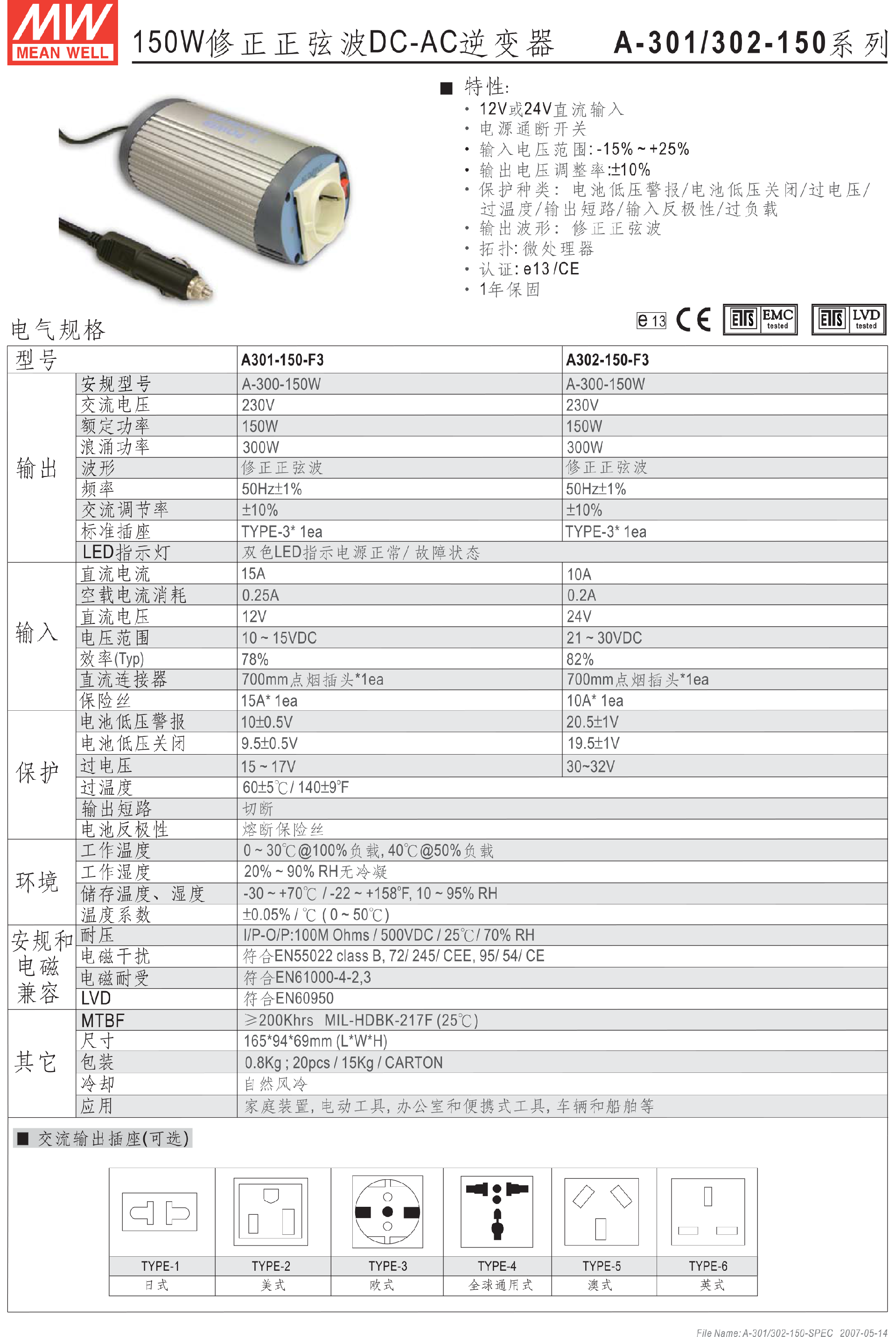 台湾明纬300W修正正弦波DC-AC逆变器A301-300-B2