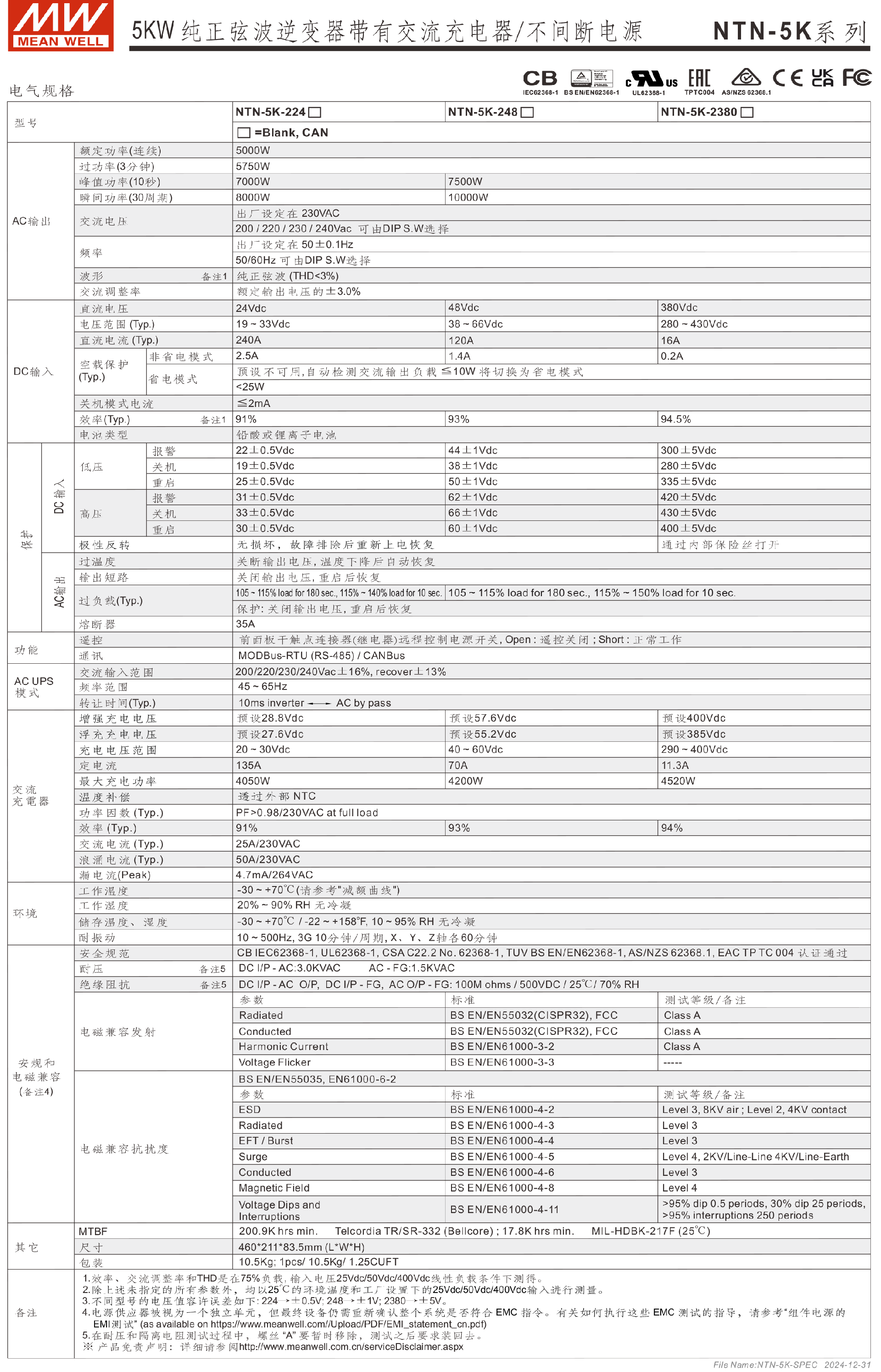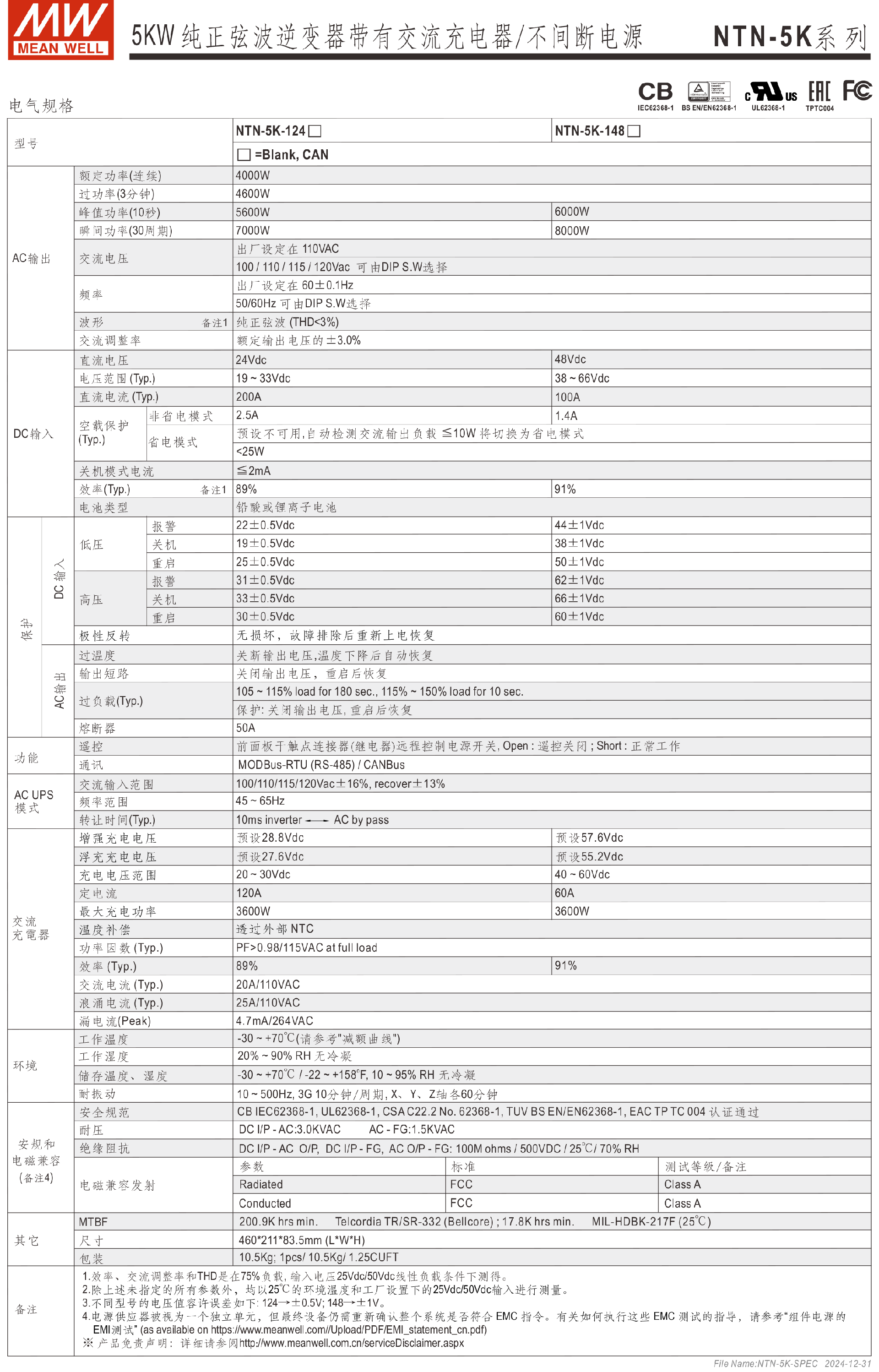 台湾明纬NTN-5K系列5KW纯正弦波逆变器