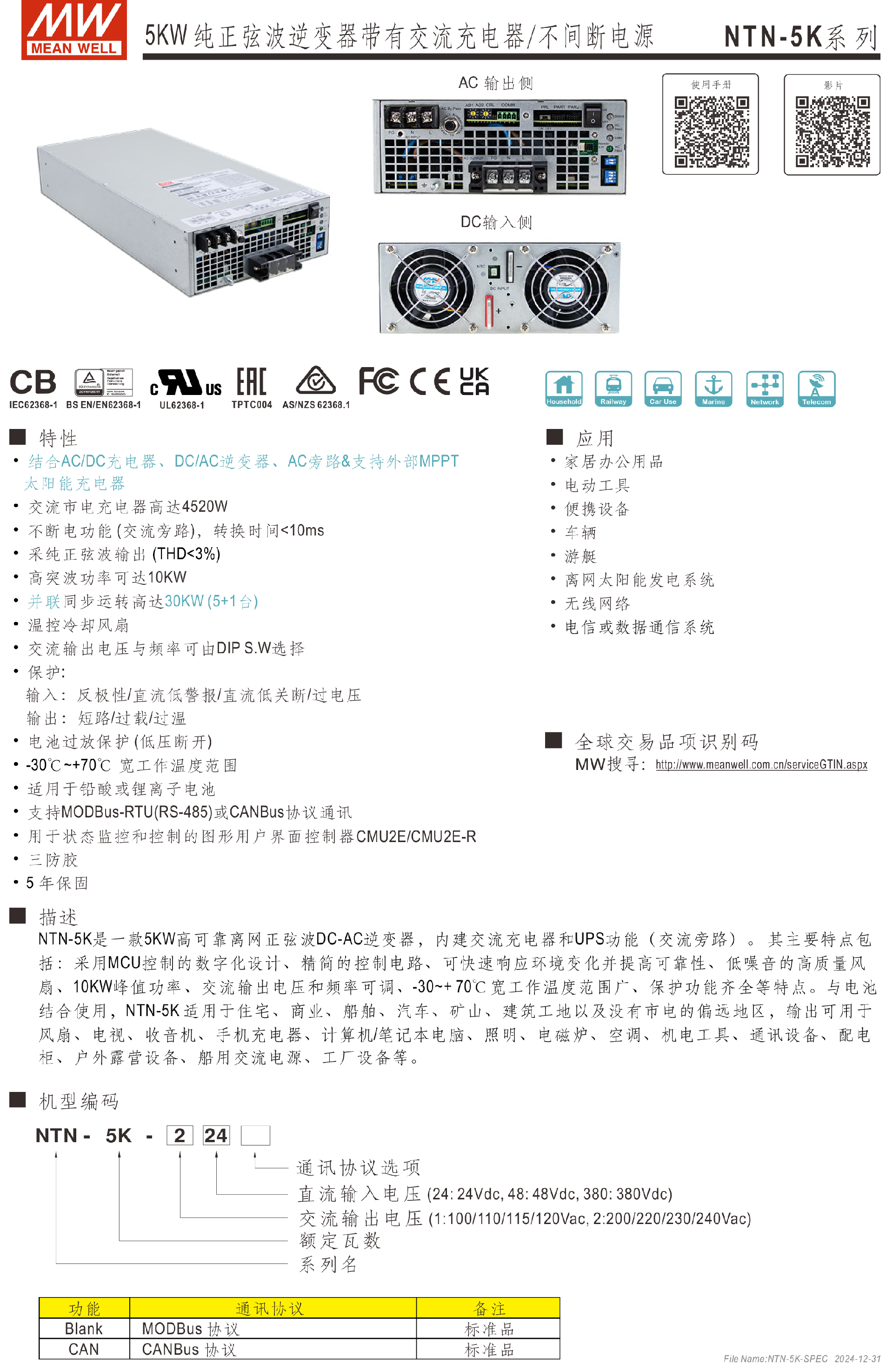 • 台湾明纬NTN-5K系列5KW纯正弦波逆变器
