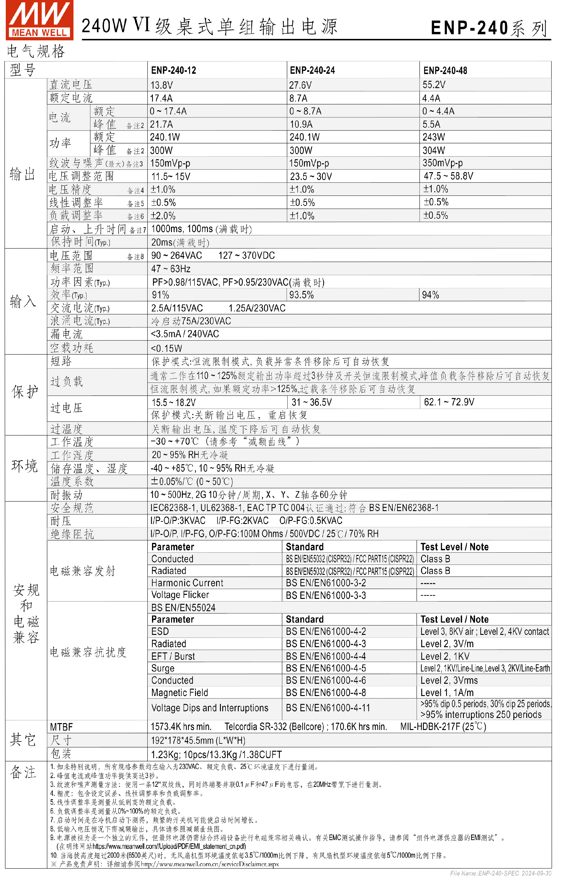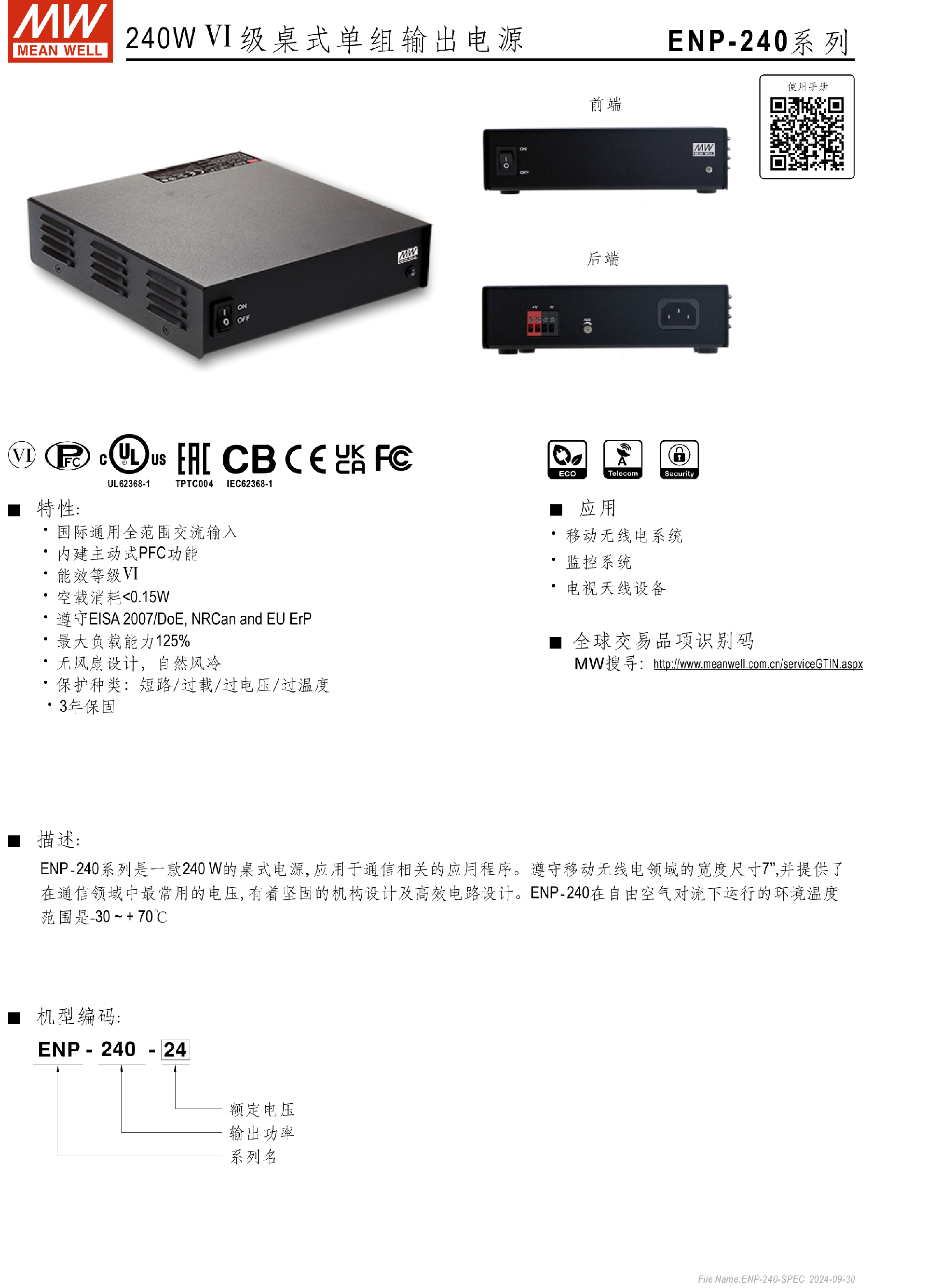 台湾明纬ENP-360系列Ⅵ级桌式单组输出电源
