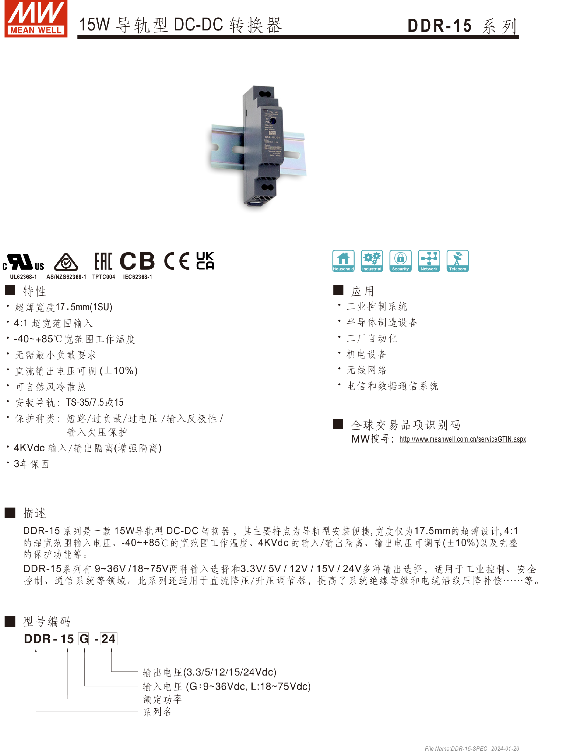 明纬电源DDR-60系列60W导轨型DC-DC转换器