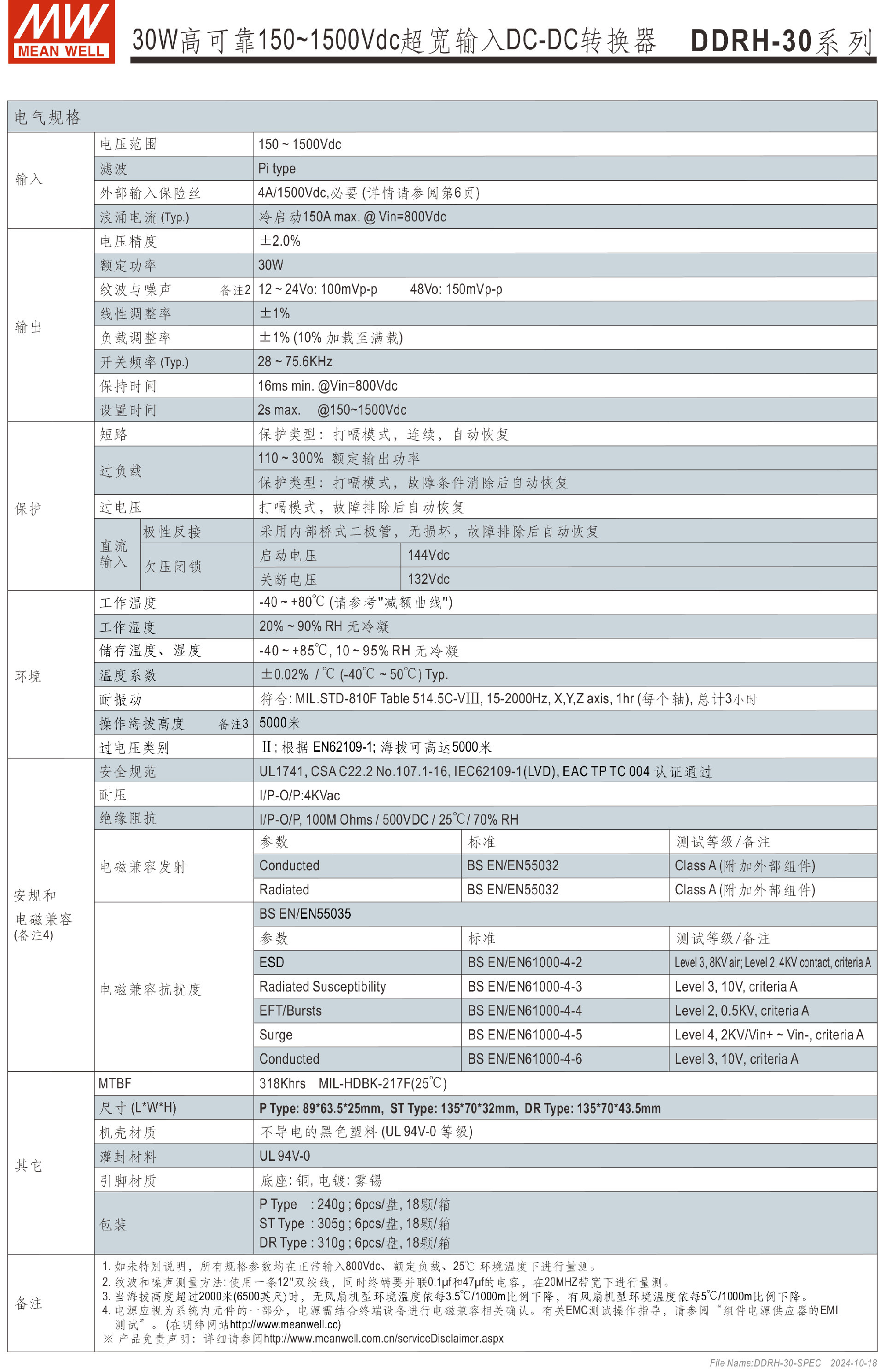 明纬电源DDRH-240系列250~1500Vdc超宽输入DC-DC转换器