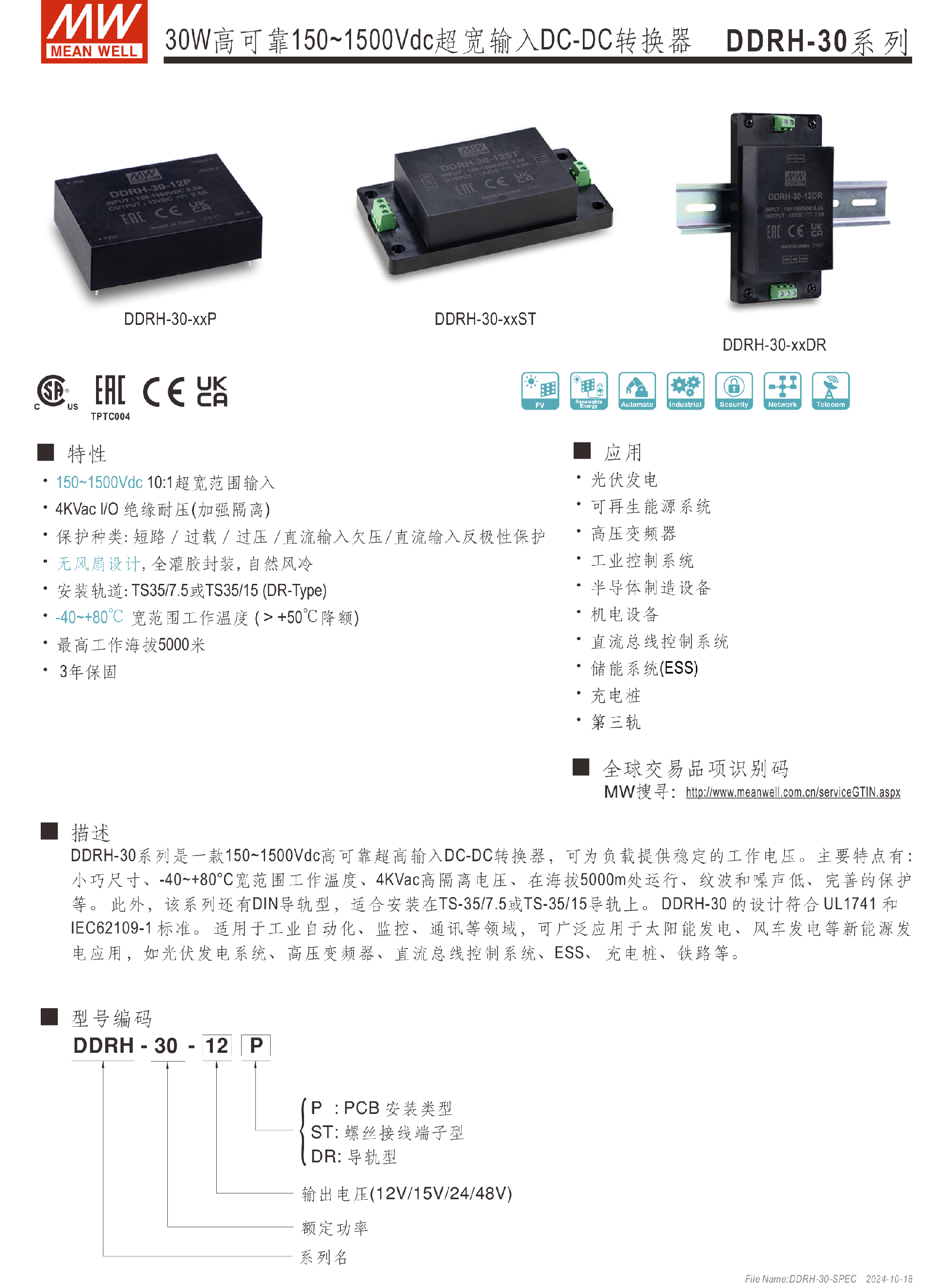 明纬电源DDRH-15系列150~1500Vdc超宽输入DC-DC转换器