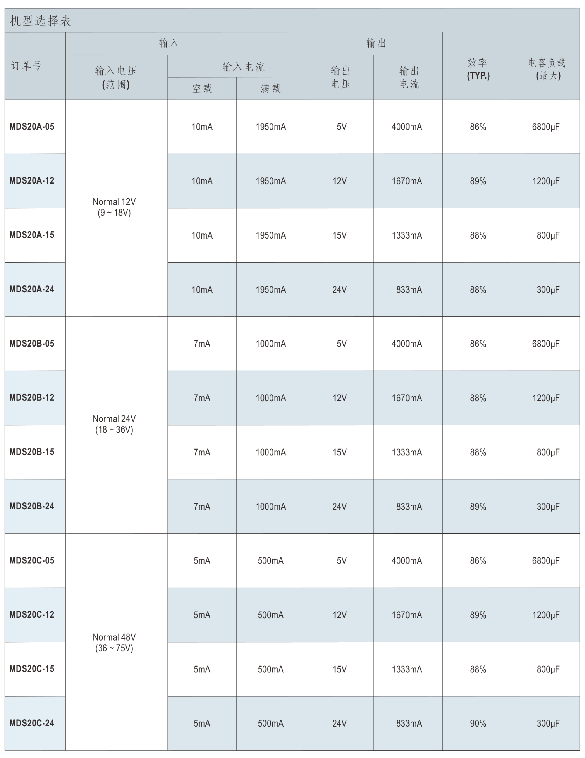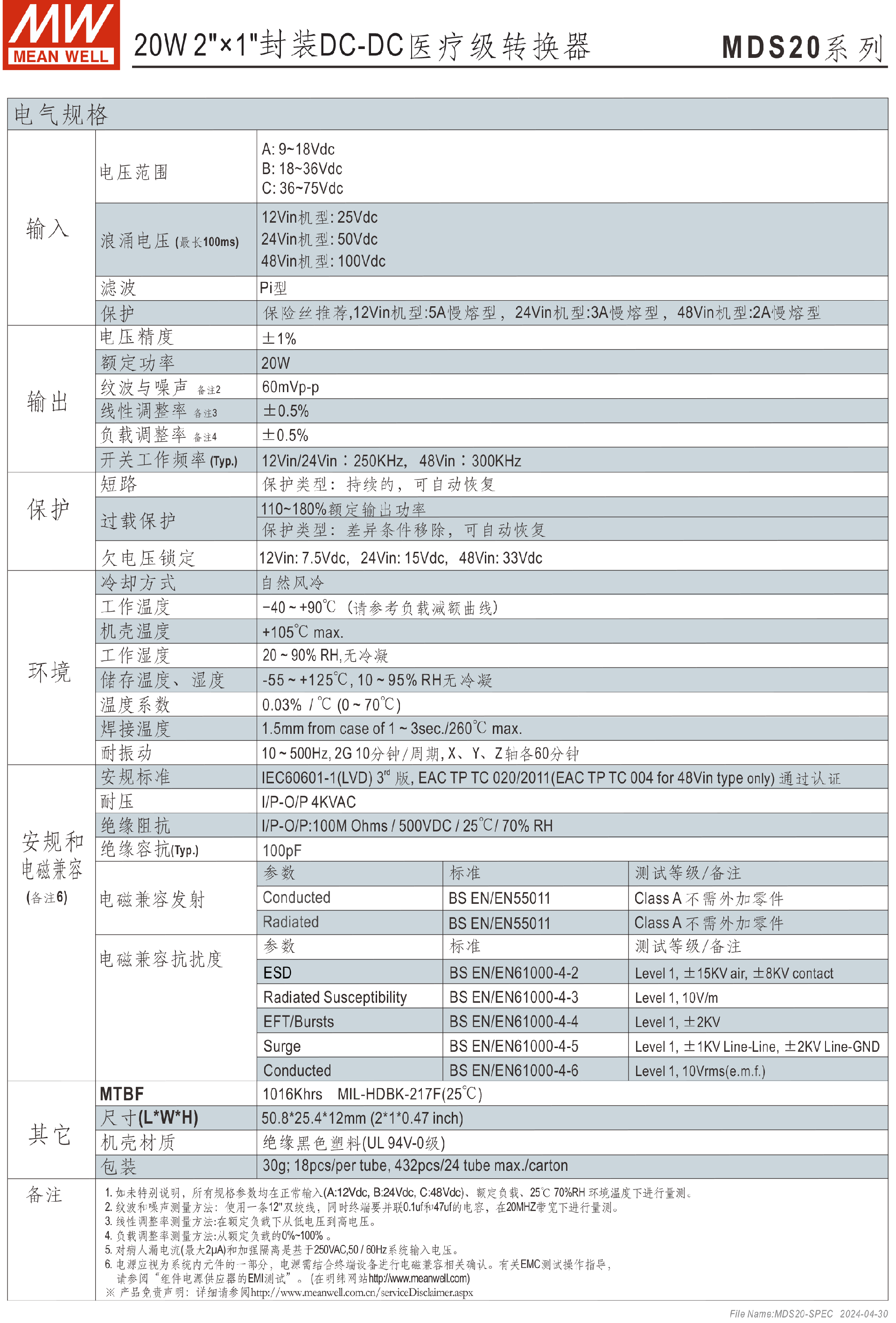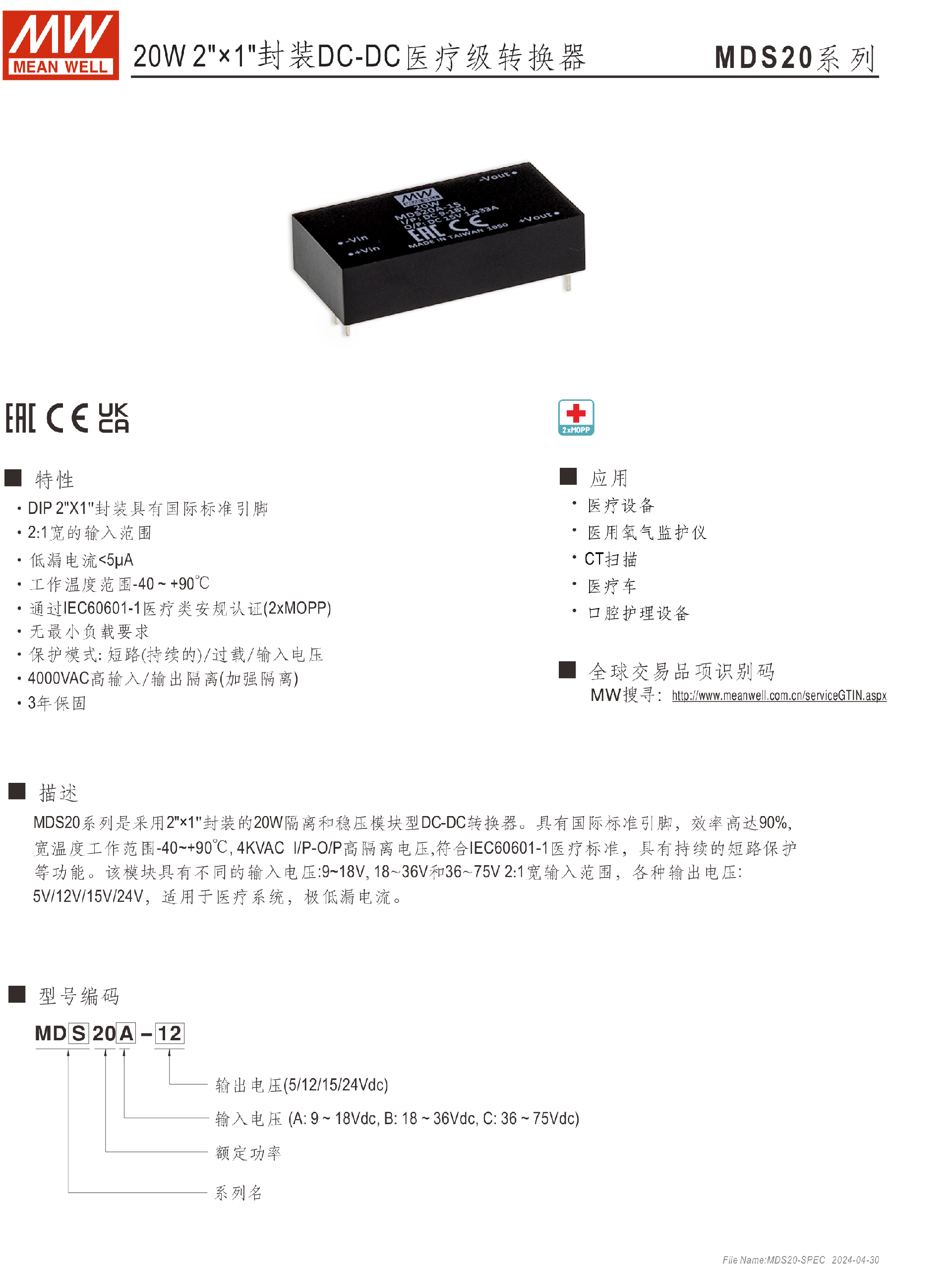 明纬电源MDS15系列15W 封装DC-DC医疗级转换器