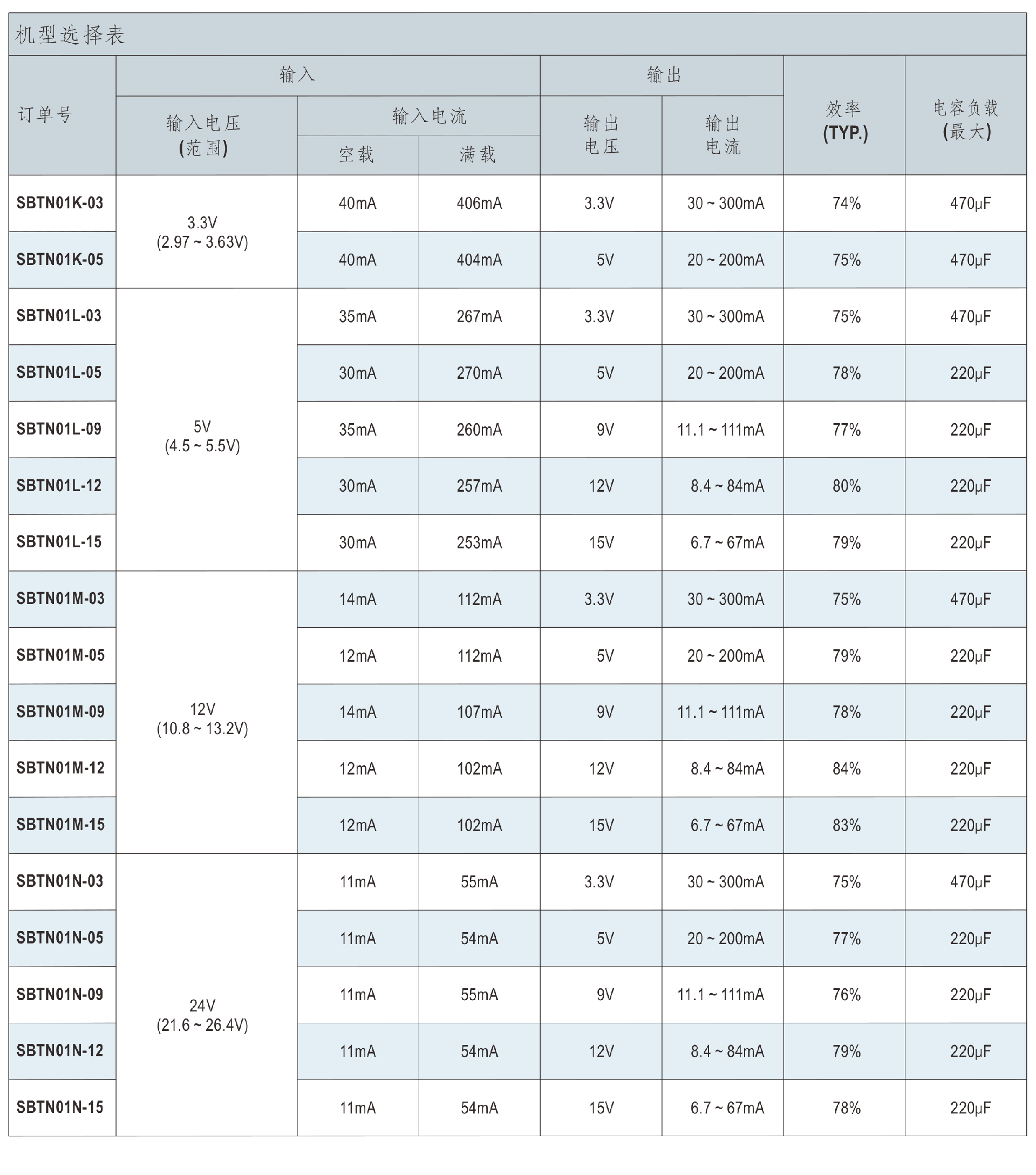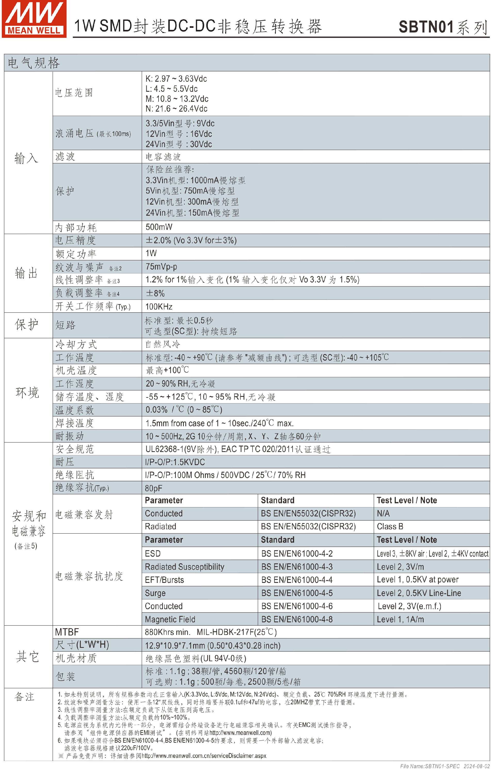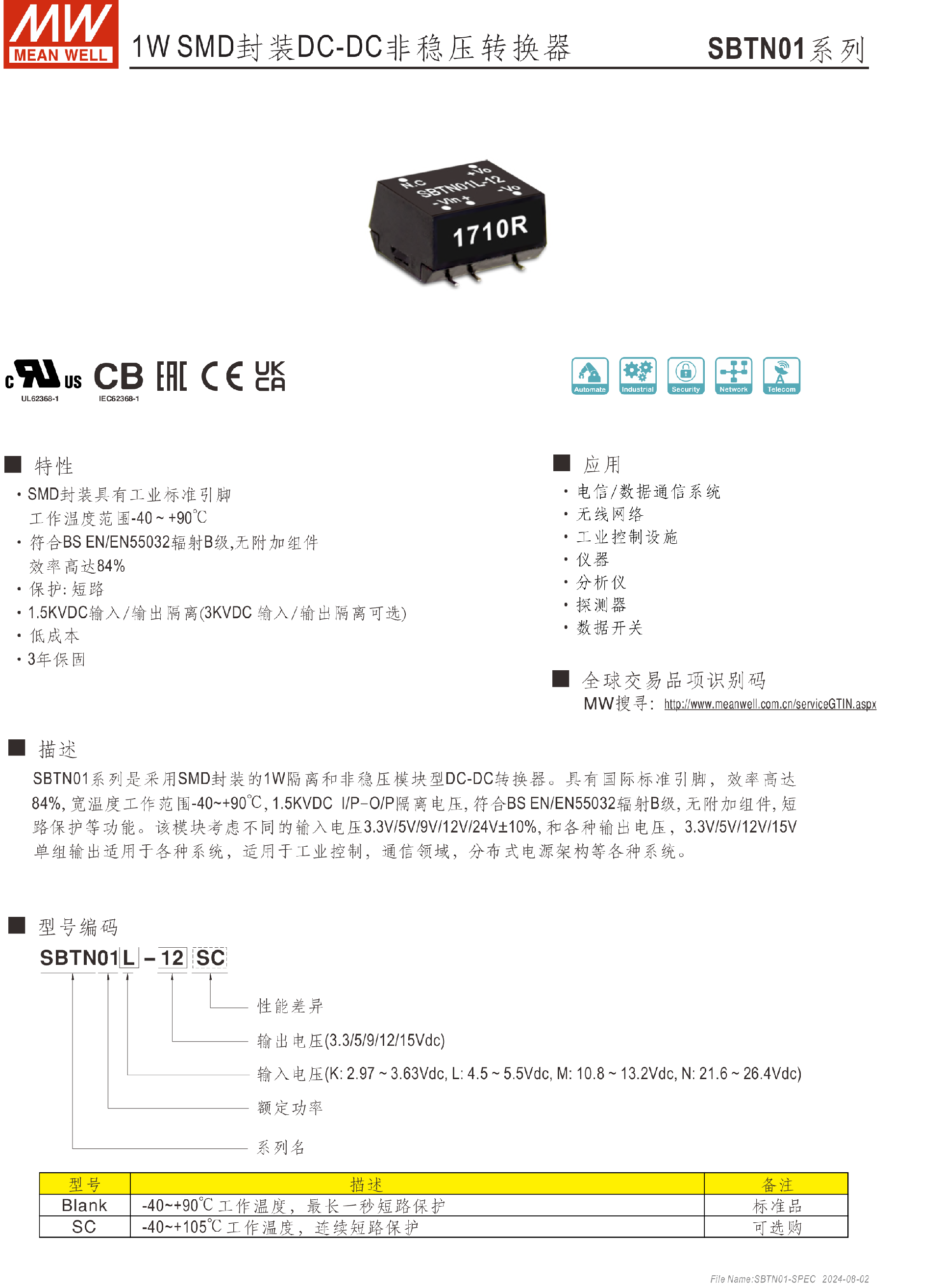 明纬电源SBTN01-N系列1W SMD封装DC-DC非稳压转换器