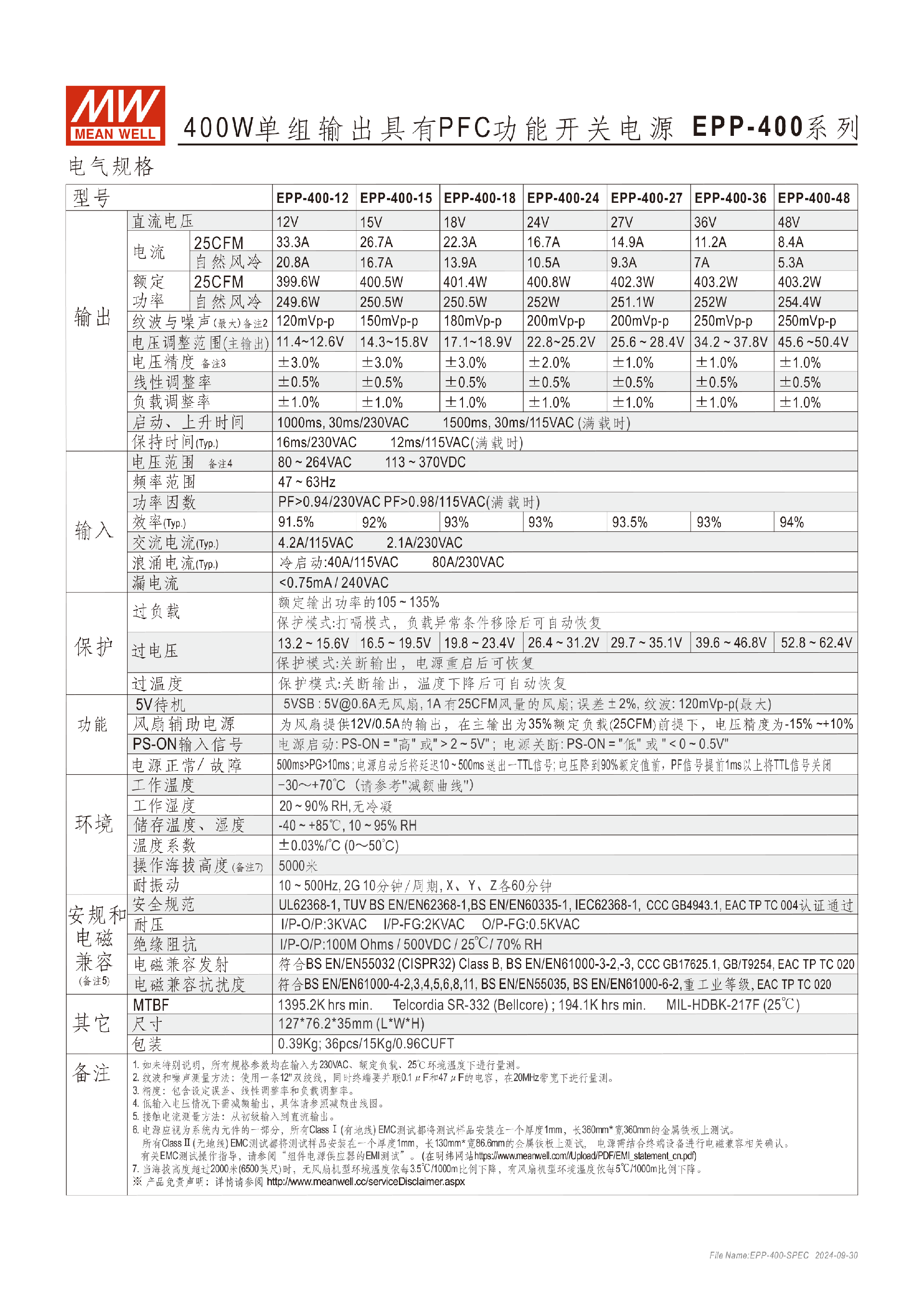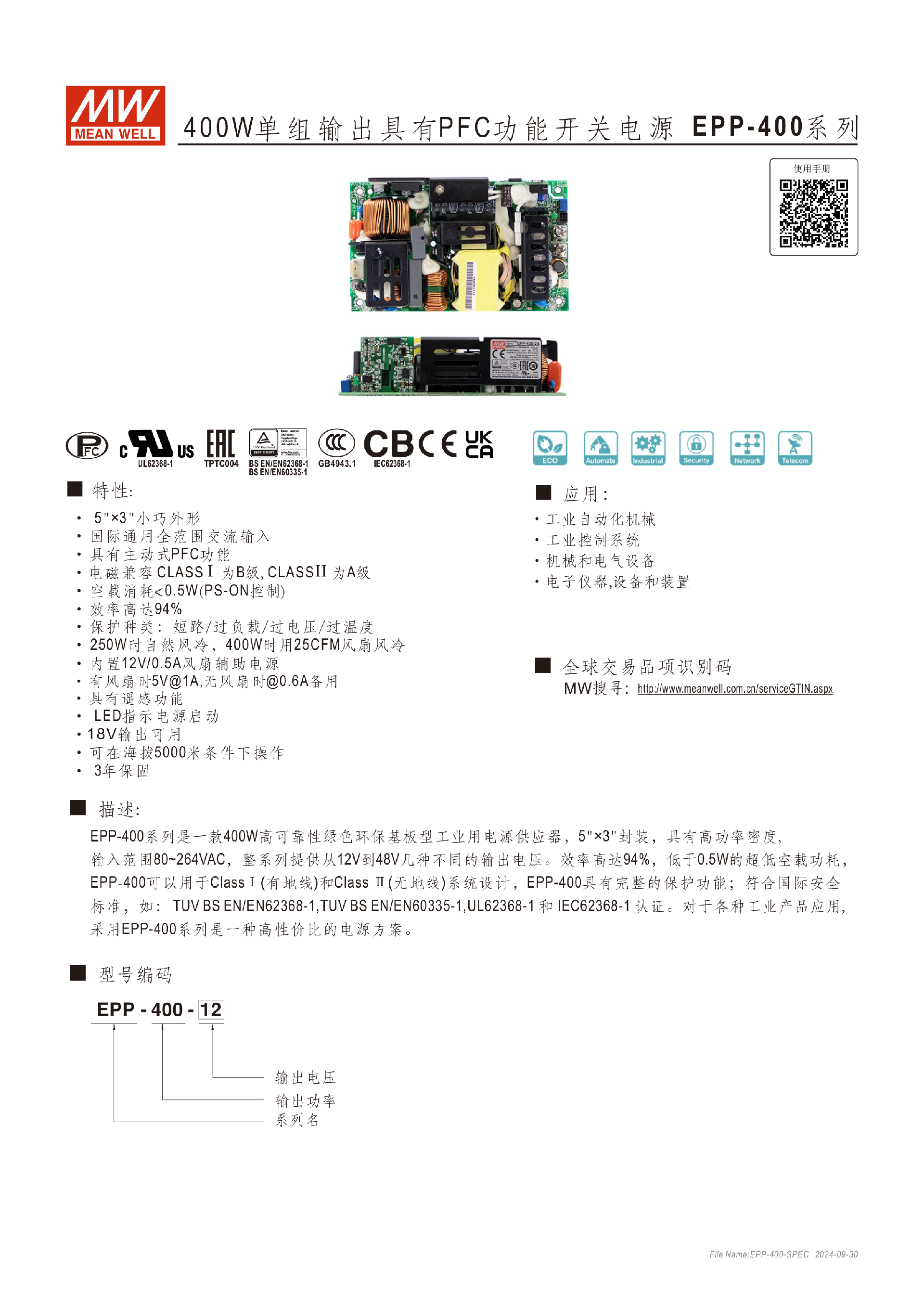 台湾明纬EPP-300系列300W单组输出开关电源