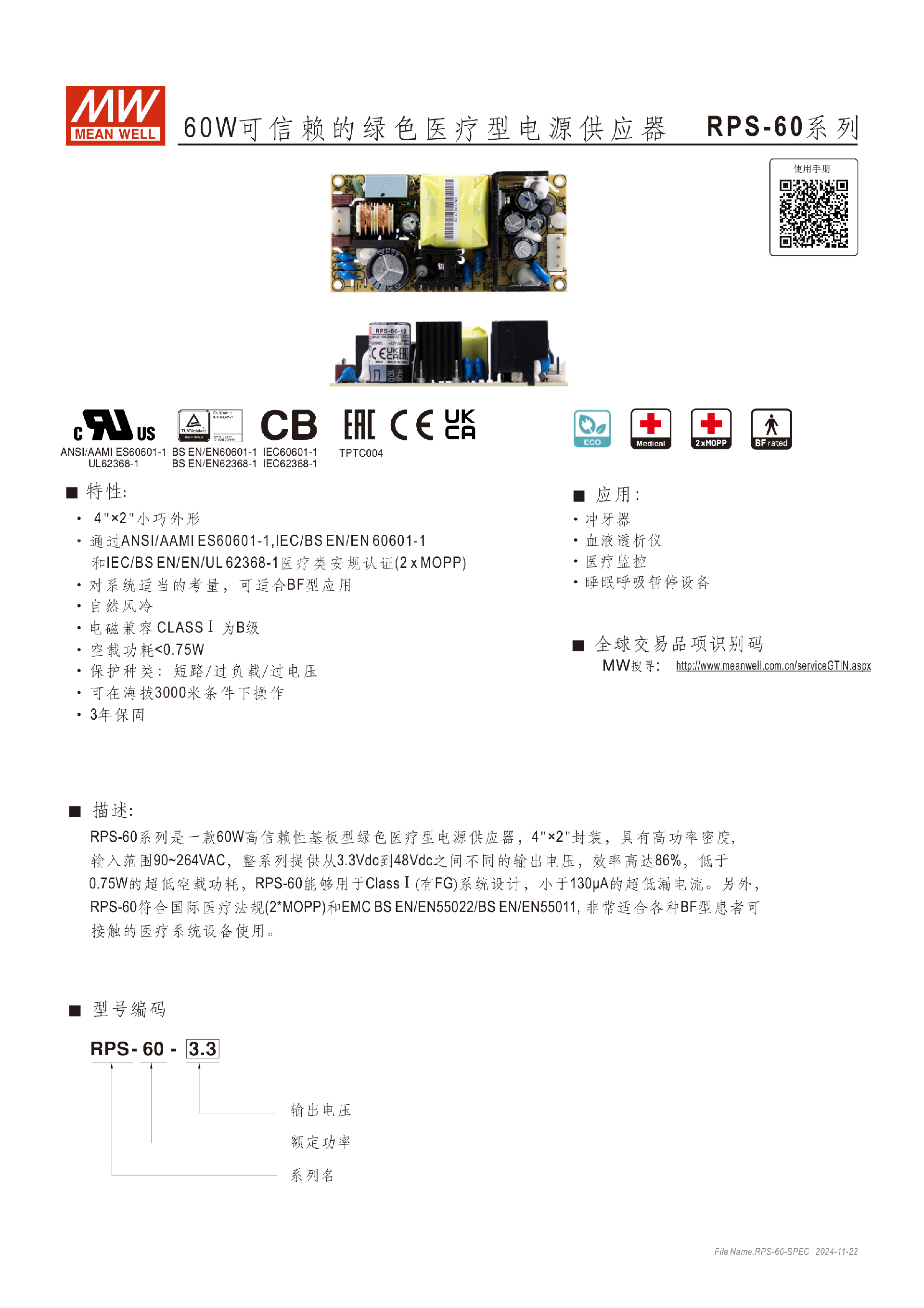 台湾明纬RPS-65系列65W医疗型电源供应器