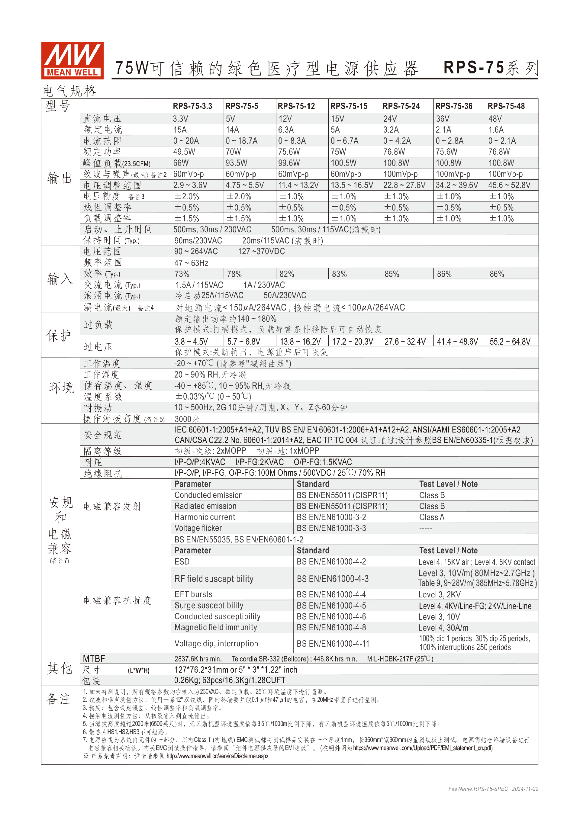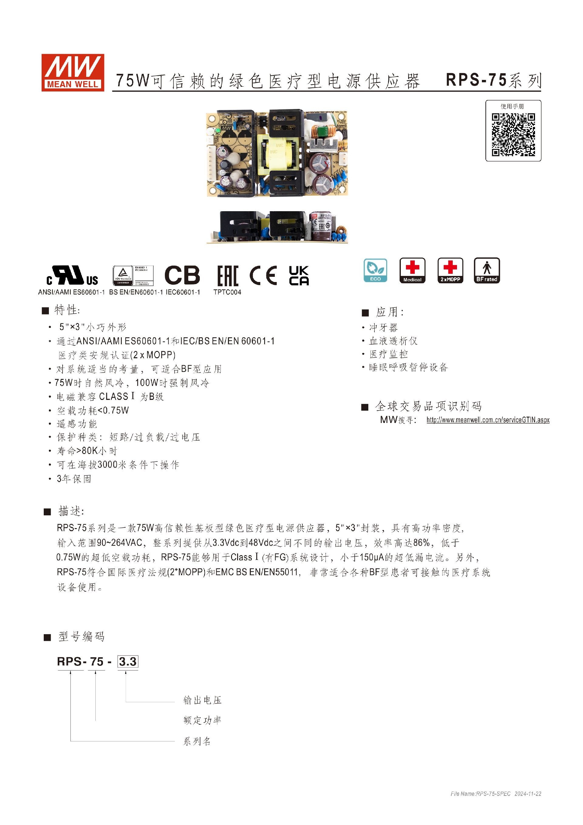 台湾明纬RPS-120S系列120W医疗型电源供应器